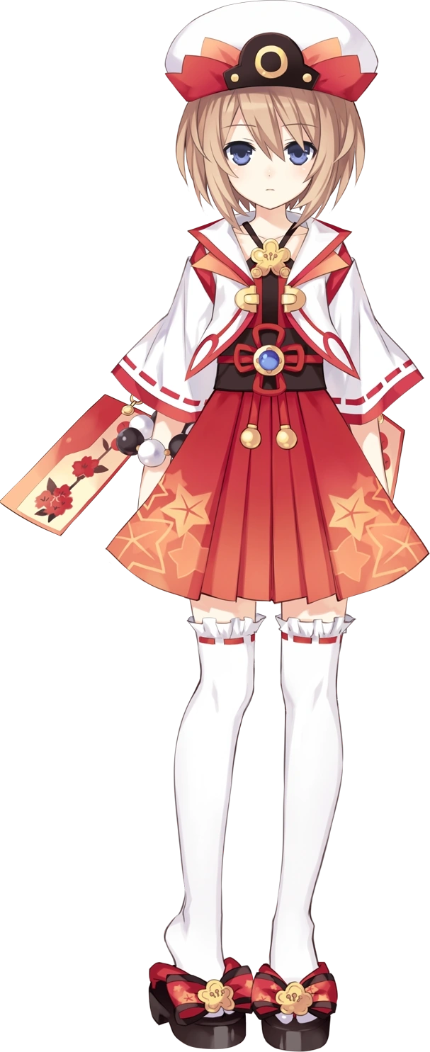 Blanc wears the Autumn Leaves outfit, a shrine maiden-like outfit. The shirt is dark brown with white sleeves that have red lining. Attached to the sleeves are hanafuda cards. In the lower part of her shirt is a blue orb surrounded with red strings that form a cross pattern. The strings also carry two bells. Her red skirt is decorated with stars that look like leaves. She wears a red and white hat, a flower necklace, a black and white bead bracelet, white socks that run up to her thighs, and slippers decorated with a red ribbon and flower,