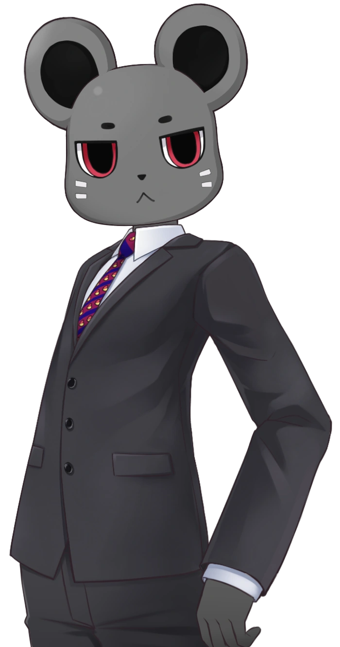 Horyuchu has the figure of an adult man with a noticeable mouse head. He wears a black business suit with a white dress shirt underneath and a magenta and blue stripped tie. The tie has some sort of yellow and red pattern decorated on the magenta strips. His face is that of a mouse, with two big ears, big eyes, small eyebrows, 4 whiskers on his cheek and a black nose.