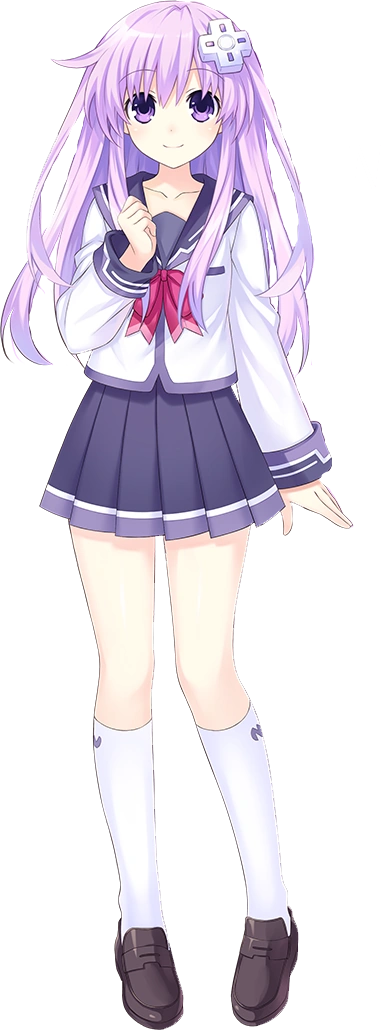 Nepgear's appearance is similar to Neptune's. She has long light purple hair with a single D-pad hair clip and violet eyes and wears a white.