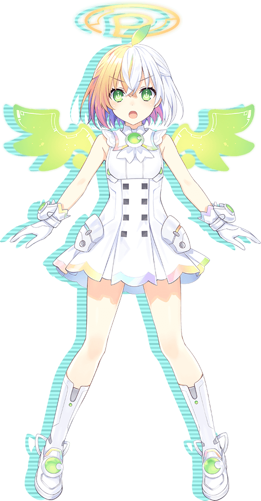 In her goddess form, her hair colors are changed to blonde and white with a green ahoge and eyes with her pupils resembling a power symbol. Her attire is all white with some green and rainbow designs and boasts matching gloves and legwear.