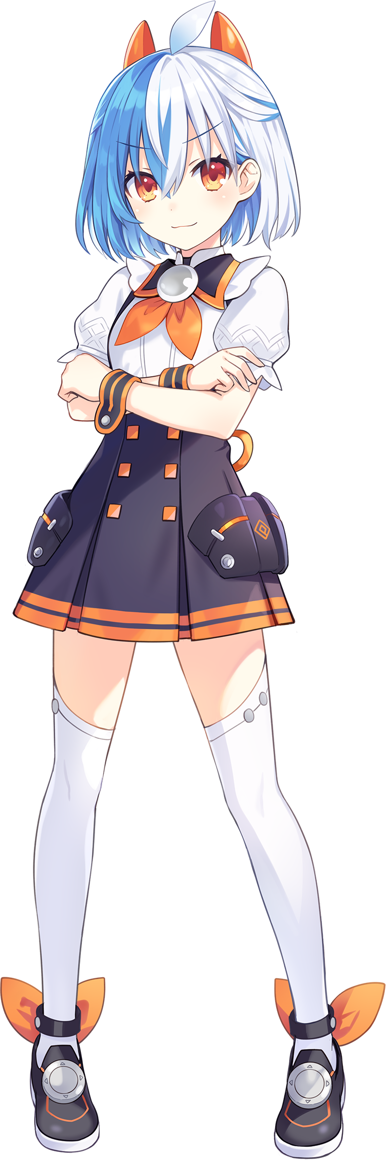 In her human form, she has short, blue and white hair split vertically and orange eyes. Her hair is wrapped into a bun on the back of her head with an ahoge and horn-like accessories on the top of her head. Her attire consists of a black and white school uniform with orange designs on her dress, tie and two large pockets with a diamond design and a bow on the back and matching cuffs. Her legwear boasts long, white thigh high socks with shoes to match her dress and orange bows on the back of each shoe.