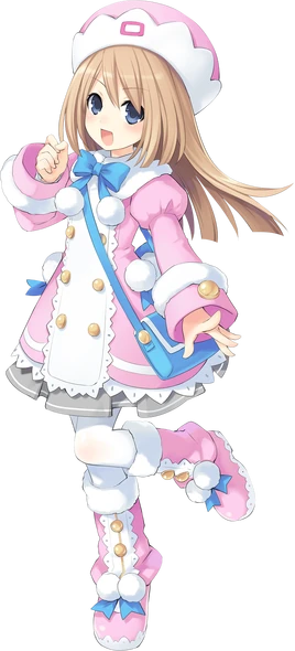 She wears a pink overcoat with white puffballs, a blue handbag and a ribbon, and a white and pink hat to match with a pink rectangle in the center. Her leg-wear consists of white tights and shoes that match her dress in design. She has long brown hair and steel blue eyes, much like her Blanc.