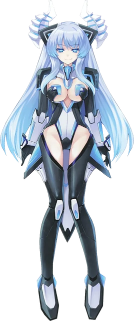 Rei's goddess form is reminiscent of her human form, having the same long heather blue hair but becomes slightly more sky-blue as it goes down. Her eyes are a bright diamond blue and they have a more angular version of the circular power symbol that most of the goddesses have, resembling the controller of the Atari 2600. The hair accessory that she wears on her head in human form becomes doubled, now appearing on both sides. Her glasses are gone and the general look of her outfit remains but in a bodysuit form, exposing her greatly enlarged chest, and the top some of her thighs, starting a little over where the torso begins and little over the middle of her thigh. The outfit itself is still primarily black and with white sections much like her previous form.