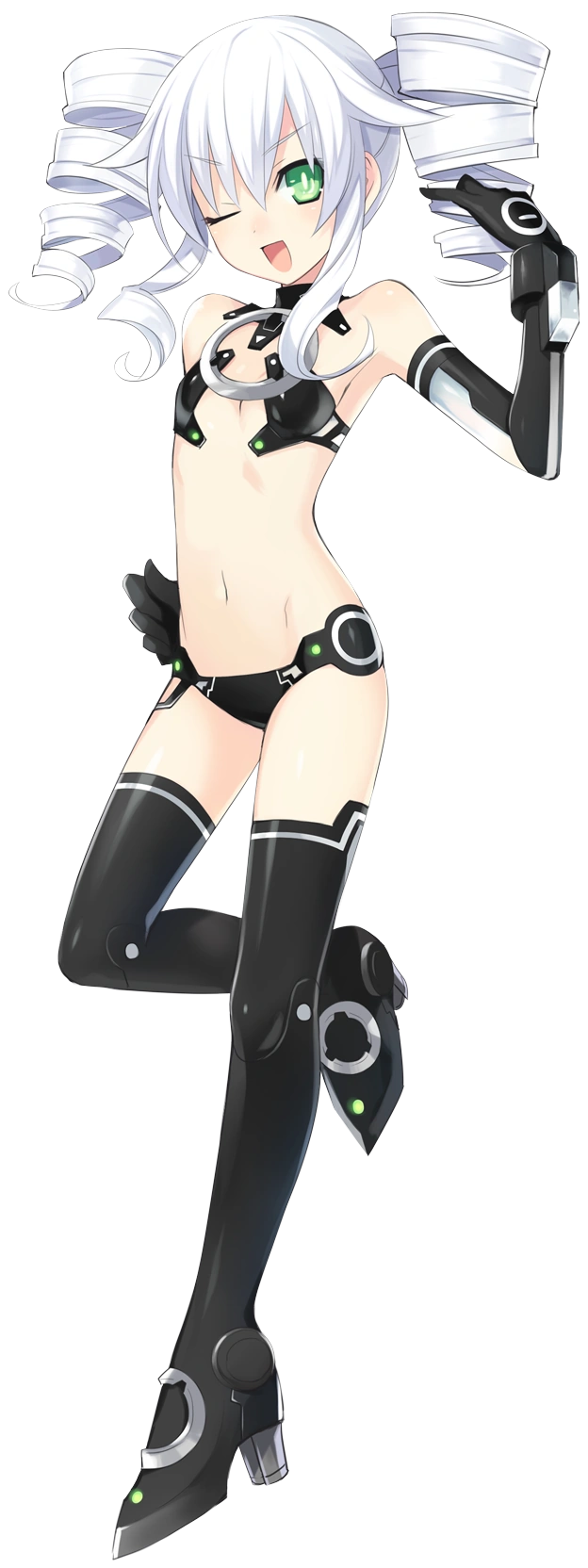 Black Sister's hair stays in pigtails but becomes white and curls up while her eyes become a bright green similar to Noire's. In the upgraded version of her default bodysuit, Uni wears a black and white two piece bikini-like bodysuit with matching shoulder length gloves and thigh-high boots with 3 inch block heels.