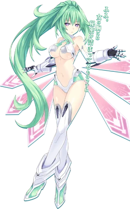 As Green Heart, she now has purple eyes and her hair remains long and is of different shades of green. It is kept in a ponytail, her fringe is normally seen above her eyes and her bangs are thick and caress her face. Her attire is a white bodysuit that is open in the middle, exposing her stomach and underside of her breasts. Her sleeves are detached and are white and black in the entirety. Her gauntlets are longer than the other CPUs with it covering the majority of her forearms with ease.