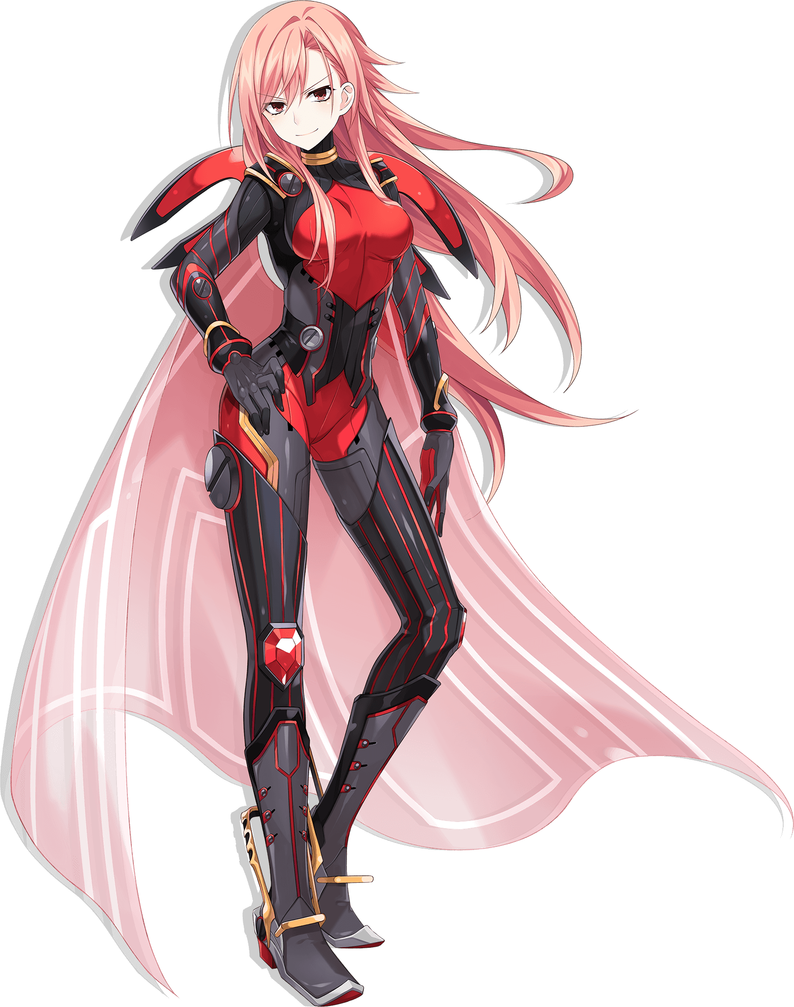 Yoh Gamer has long, peach hair and red eyes and wears a black, gray and red bodysuit with a translucent cape, red gems on her kneecaps, and gloves and boots to match her attire.